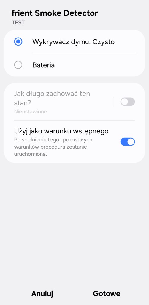 Tworzenie procedur (dawniej automatyzacje) „Jeśli … to Wtedy” ze względu na specyfikę urządzenia. Możliwe jest tylko wykorzystanie warunku „jeśli”. Czujnik pozwala na wybranie opcji „Wykrywacz dymu”, czyli powiadomienie o wykryciu dymu, posiada on dwa stany „Wykryto dym” oraz „Czysto”. Druga informacja dotyczy poziomu baterii, mierzonej w zakresie 0 – 100% w tym, czy jest pasująca, większa/mniejsza czy w określonym zakresie. Każdą akcję możemy opóźnić o dowolny czas oraz określić, jako warunek wstępny.