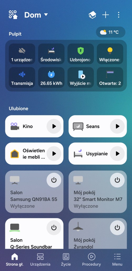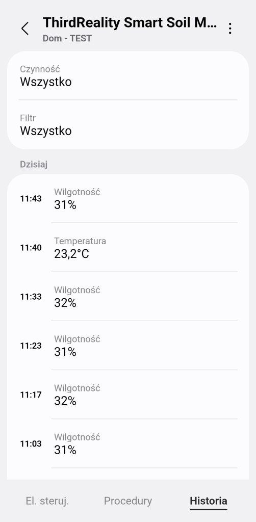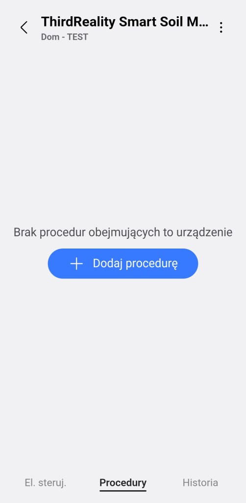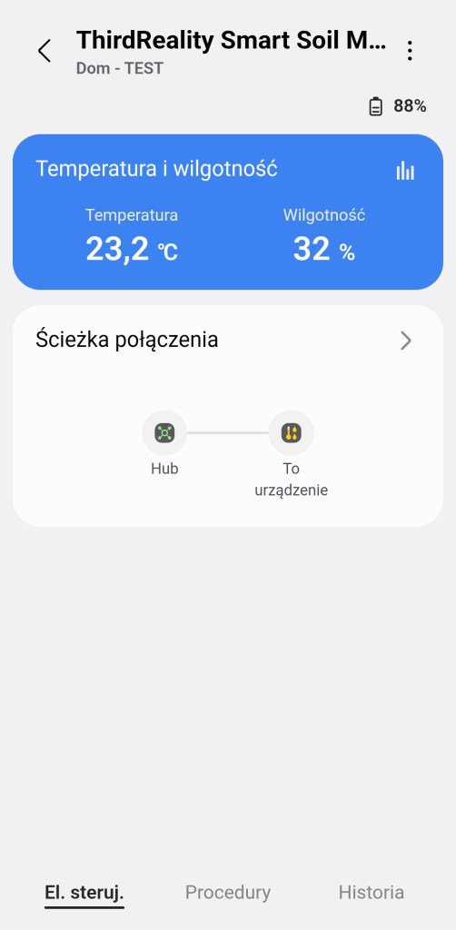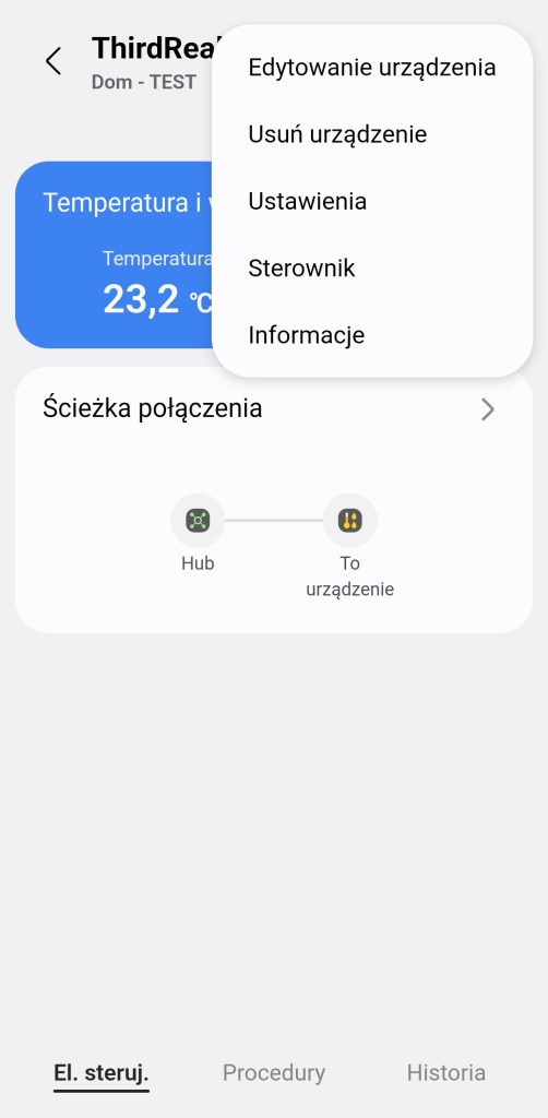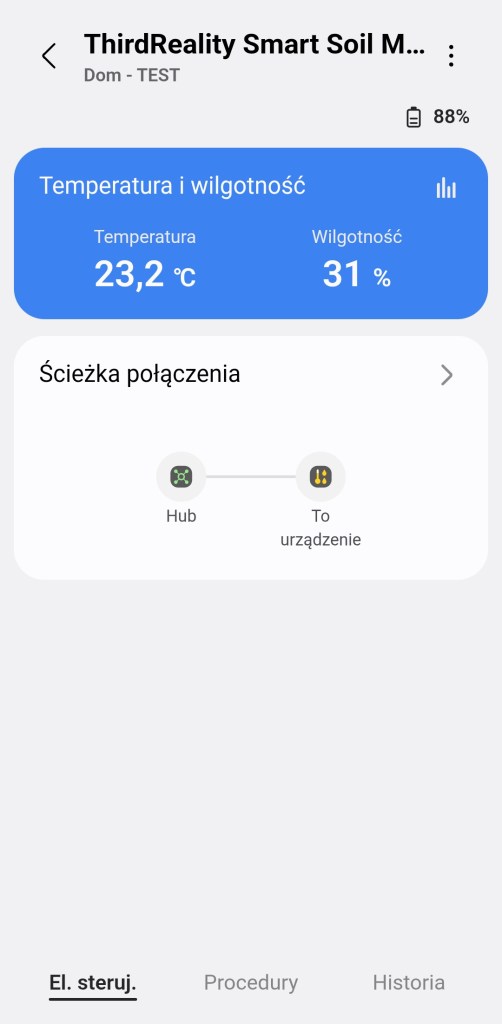W głównym panelu czujnika mamy możliwość odczytania zmierzonej temperatury i wilgotności. Ukazanie tendencji na wykresach: godzinowym, 24h i 31 dni. Mamy informację o aktualnym poziomie baterii, zaraz po dodaniu urządzenia, chwilę zajmuje pierwsza aktualizacja stanu. Na końcu zobaczymy, jaka jest ścieżka połączenia czujnika z hubem. Na dole znajdziemy sekcję panel „Procedury” (dawniej „Automatyzacje”) znajdziemy listę procedur, gdzie jest używany czujnik. Panel „Historii” również nie różni się znacznie od innych urządzeń, mamy dostęp do sortowania i przestudiowania historii odczytów czujnika. W ustawieniach „Edytuj” mamy standardową możliwość zmiany nazwy, pokoju oraz możliwość dodania do panelu „Ulubione”.