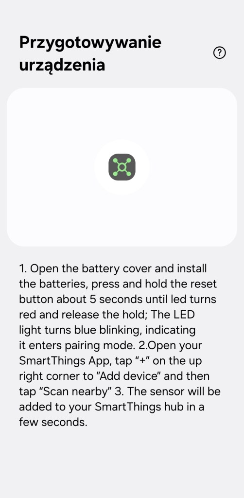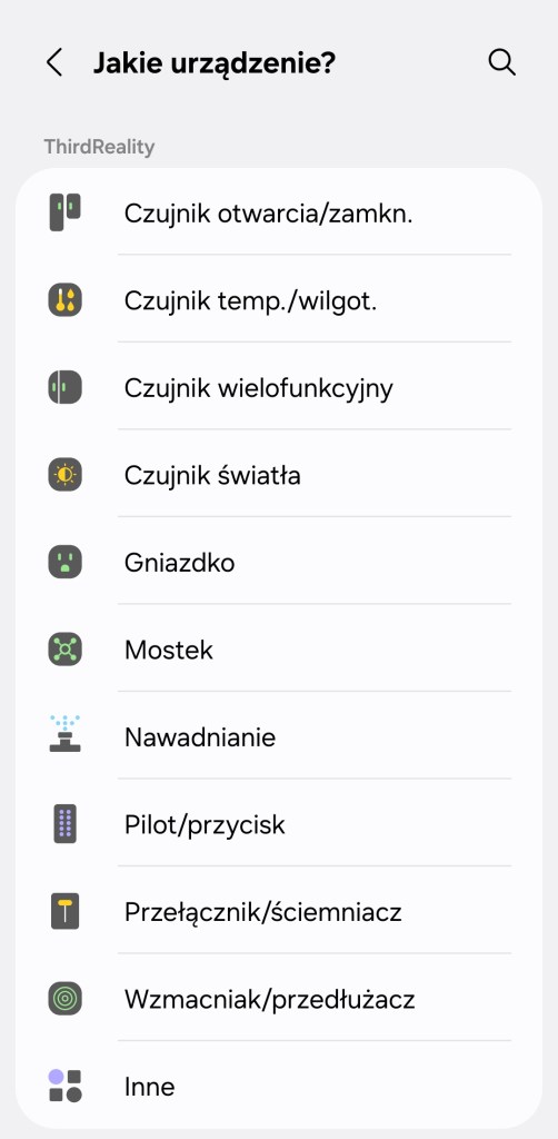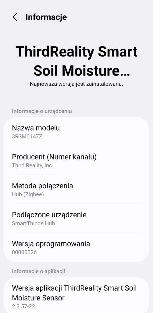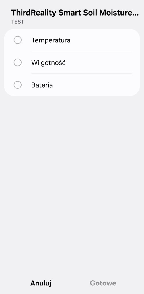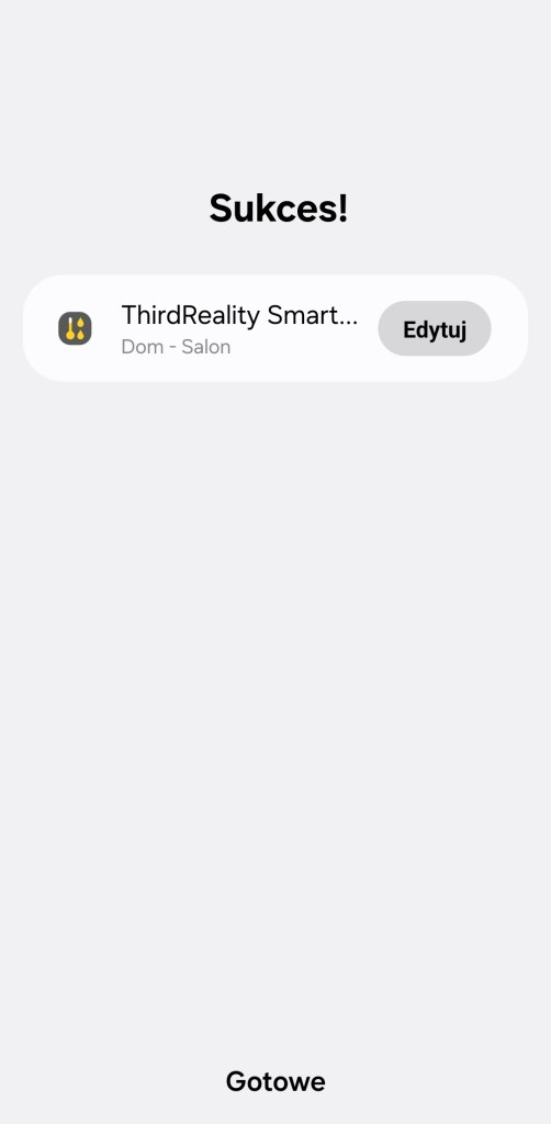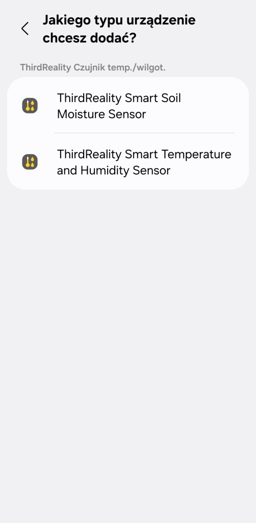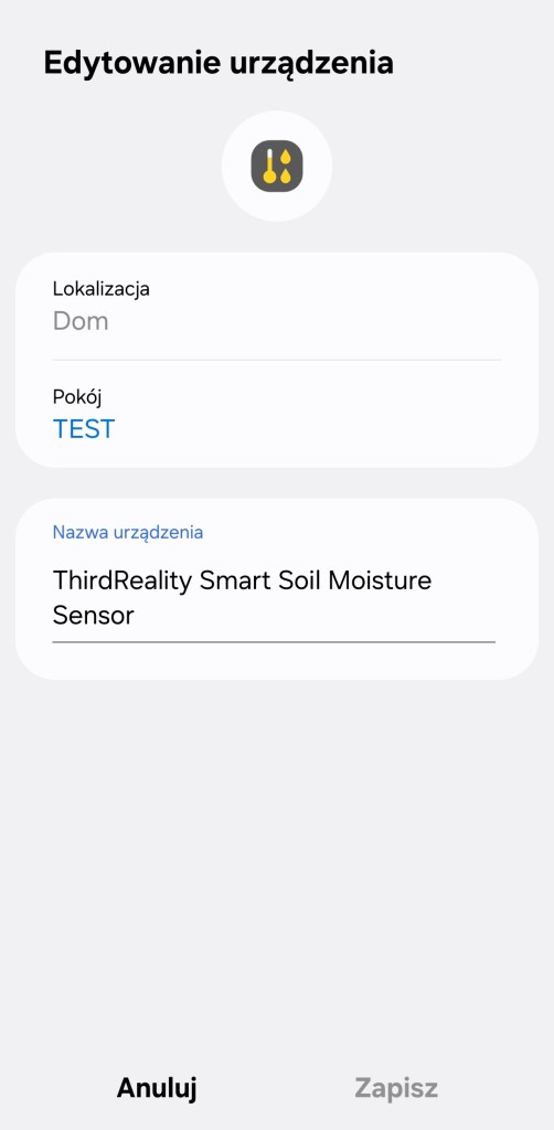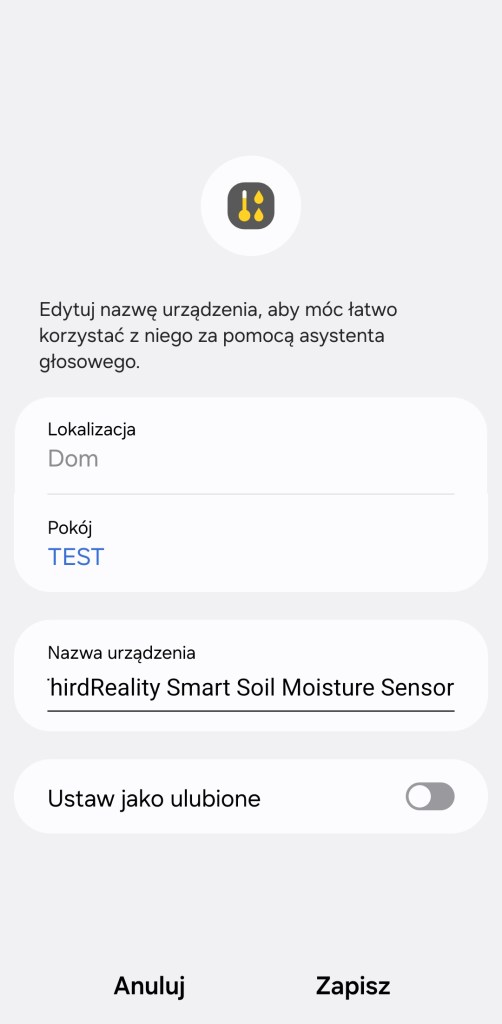 Aby dodać czujnik do aplikacji SmartThings. Na ekranie aplikacji, klikamy Dodaj ( + ), znajdziesz go w prawym górnym rogu ekranu. Następnie Dodaj urządzenie, w sekcji Urządzenia partnerów wybierz ThirdReality. Z dostępnych urządzeń wybierz Czujnik temp./wilgot. i wybierz model ThirdReality Smart Soil Moisture Sensor. Nie mamy dołączonego kodu QR więc Pomiń ten krok. Rozpocznie się wyszukiwanie nowego urządzenia. Jeśli jeszcze tego nie zrobiłeś, na obudowie czujnika, przytrzymaj przycisk resetu przez 5 sekund. Po chwili sensor zostanie wykryty i dodany do ekosystemu SmartThings. Po pomyślnym znalezieniu urządzenia możemy zmienić jego nazwę, wybrać pokój, do którego ma trafić. Można dodać sensor do panelu ulubionych. Kończymy proces instalacji, klikając Gotowe. Czujnik temperatury i wilgotności pojawi się w wybranym pomieszczeniu.