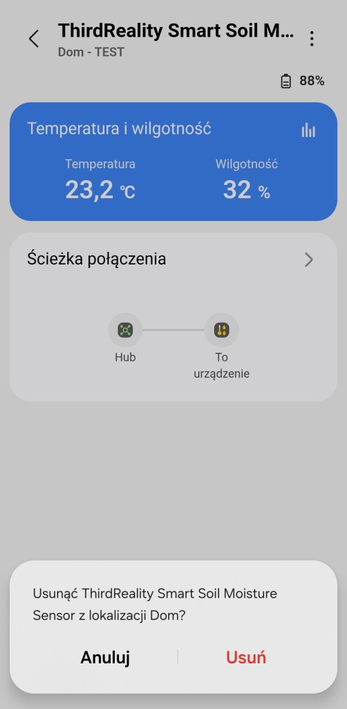 Aby usunąć sensor z ekosystemu SmartThings, należy wejść w panel sterowania urządzeniem. Kliknąć Więcej opcji ( ⋮ ) w prawym górnym rogu ekranu, i wybrać Usuń urządzenie. Następnie potwierdzamy operację, stukając Usuń.