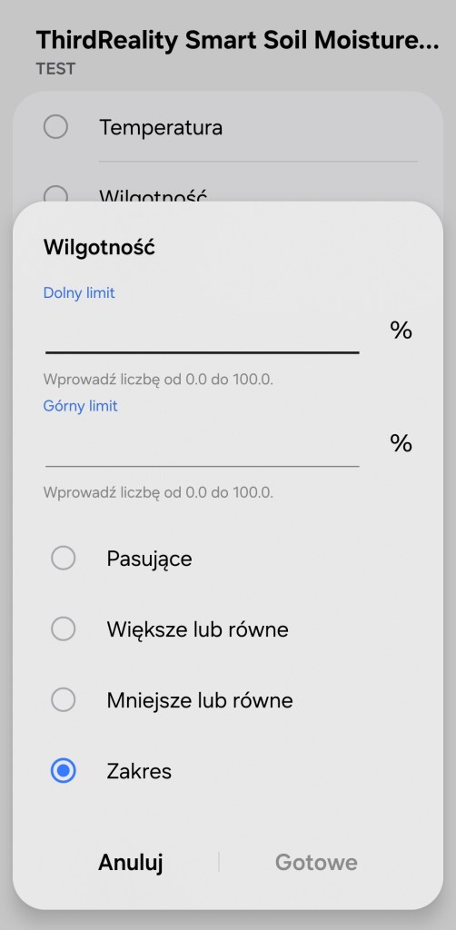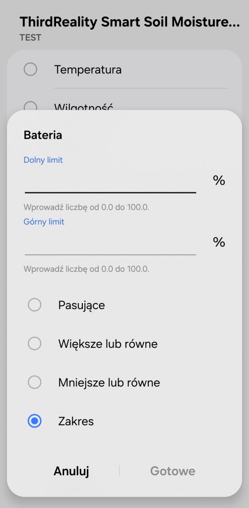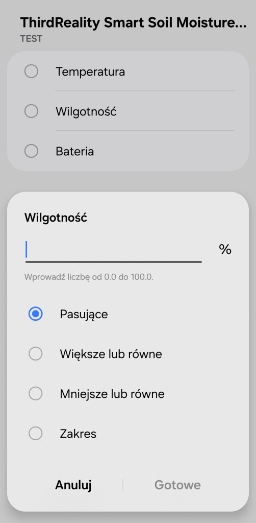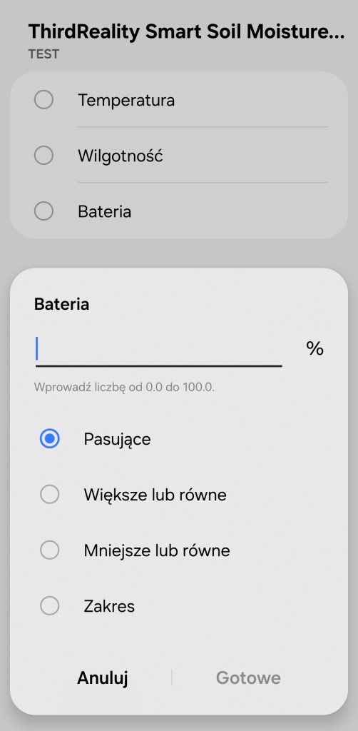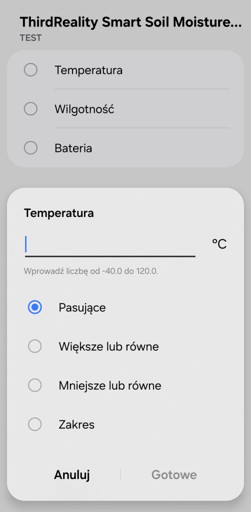 Tworzenie procedur (dawniej automatyzacje) „Jeśli … to Wtedy” ze względu na specyfikę urządzenia. Możliwe jest tylko wykorzystanie warunku „jeśli”. Czujnik pozwala na wybranie opcji „Temperatura”, czyli powiadomienie o temperaturze z zakresu -40 – 120°C, oczywiście jest to błędem sensor pozwala na pomiar z zakresu -10 – 55°C. Oczywiście możemy ustawić zależność: czy są większa/mniejsza niż odczytana oraz wyznaczony zakres. Dalej jest „Wilgotność” w odczytach 1 – 100%, czy większa/mniejsza niż wyznaczona oraz, czy znajduje się w podanym zakresie. Ostatnia informacja dotyczy poziomu baterii, mierzonej w zakresie 0 – 100% w tym, czy jest pasująca, większa/mniejsza czy w określonym zakresie. Każdą z tych inicjacji procedury można opóźnić o dowolny czas i określić jako warunek wstępny.