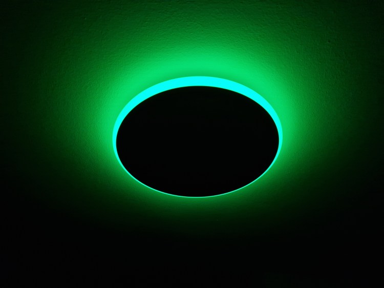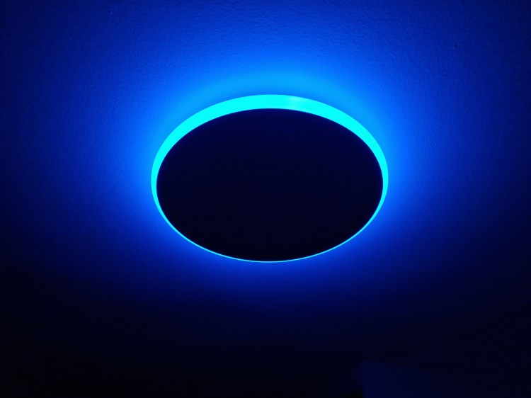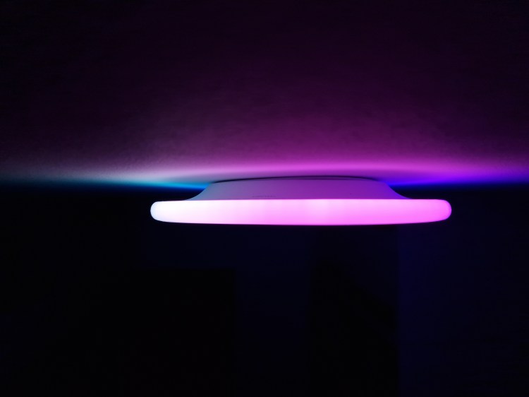 Lampa zapewnia szerokie spektrum światła białego, które zgodnie z zapewnieniami producenta nie męczy wzroku. Światło jest bardzo przyjemne, równo rozprowadzone i dyfuzowane po całej lampie dzięki czemu gołym okiem nie zauważymy pojedynczych diod led oraz cały pokój oświetla równomiernie. Wersja w rozmiarze 30cm jest przeznaczona raczej do mniejszych pomieszczeń – do ok. 20m². Akcentowe podświetlenie RGB ma również bardzo duże zagęszczenie diod, więc efekty dynamiczne są płynne i nie widać przejść między kolorami i pojedynczymi ledami. Odwzorowanie kolorów jak na urządzenia Yeelight przystało jest bardzo dobre, a co za tym kolory są bardzo nasycone, żywe. Należy zauważyć, że podświetlenie akcentowe ma zdecydowanie niższą jasność. Na minus zasługuje, również brak czystego koloru białego w podświetleniu RGB.