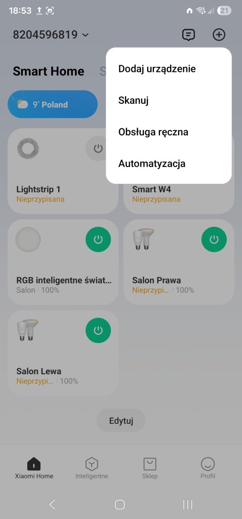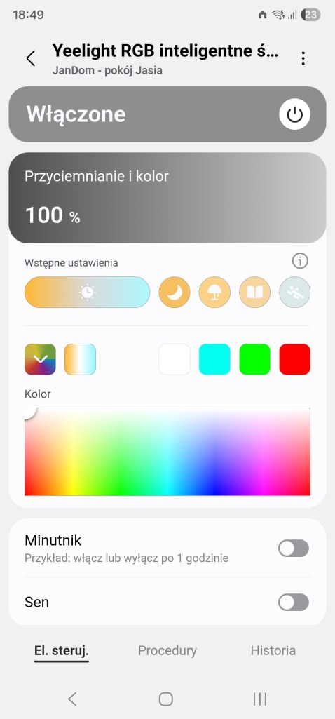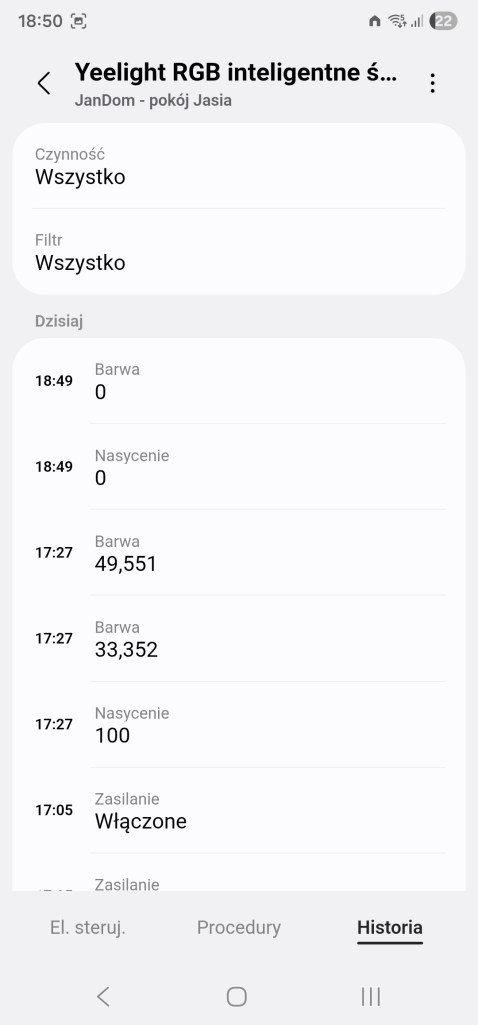W sekcji „Procedury” możemy szybko ustawić harmonogramy pracy urządzenia i inne automatyzacje, a panel „Historii” pozwala na wygodne śledzenie aktywności oświetlenia. W ustawieniach edycji możemy zmienić nazwę, ikonę czy przypisanie lampy do konkretnego pokoju.