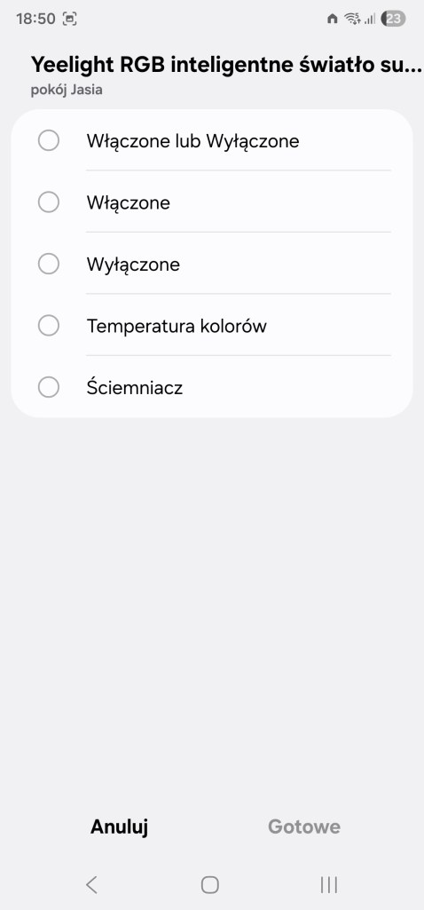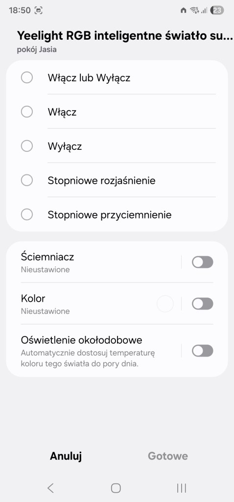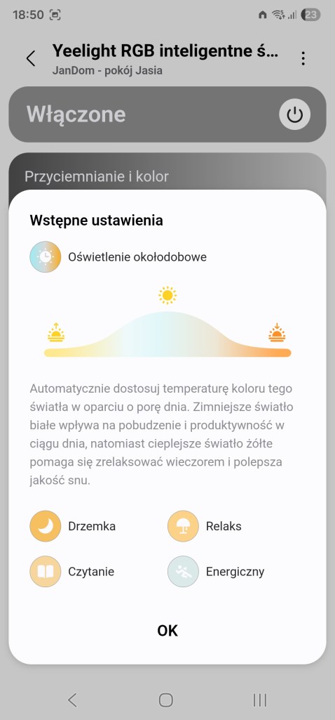 W głównym panelu SmartThings możemy: włączać i wyłączać lampę oraz regulować jasność. Zmieniać temperaturę barwową, aplikacja pozwala na zakres 2200K – 9000K, mimo że fizyczne diody mają węższy zakres. Korzystać z oświetlenia adaptacyjnego (zmiana barwy bieli zależnie od pory dnia) oraz funkcji Sen (stopniowe wygaszanie światła). Sterować kolorowym podświetleniem akcentującym za pomocą panelu kolorów.