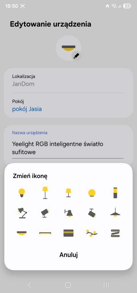 Aby usunąć lampę z ekosystemu SmartThings, należy wejść w główny panel urządzenia. Kliknąć trzy kropki ( ⋮ ) w prawym górnym rogu ekranu, i wybrać Usuń urządzenie. Następnie potwierdzamy operację. Jeśli nie chcemy, aby lampa ponownie pojawiła się w aplikacji SmartThings wystarczy odłączyć usługę Yeelight.