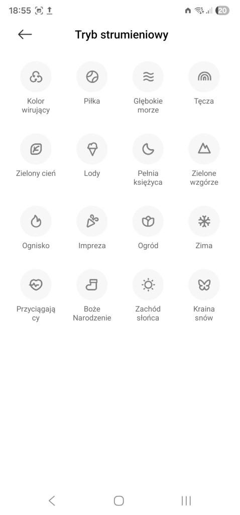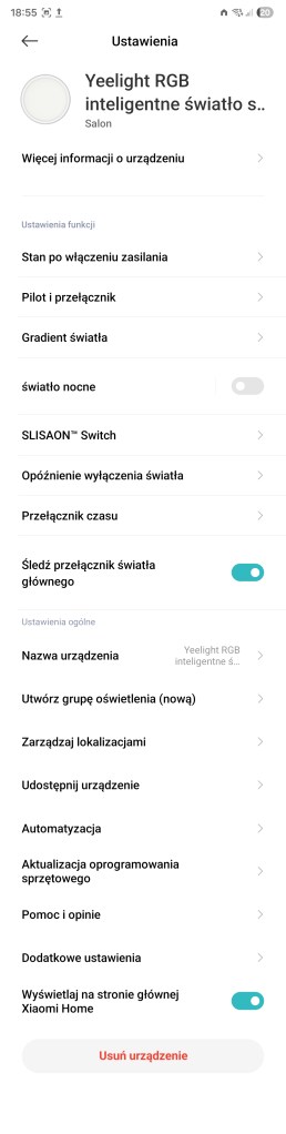 W aplikacji od Xiaomi możemy użyć znaleźć tryby flow, czyli animacje kolorowego podświetlenia oraz sceny np. efekt świecy. W ustawieniach znajdują się takie opcje jak ustawienie domyślnego stanu po włączeniu, zarządzanie pilotem, czasy rozświetlania i wygaszania światła, tryb światła nocnego, opcja sterowania włącznikiem SLISAON, oraz standardowe ustawiania: zmiana nazwy, minutniki, aktualizacja oprogramowania.