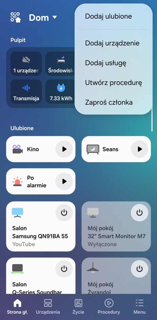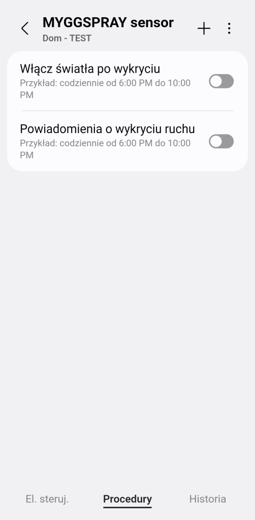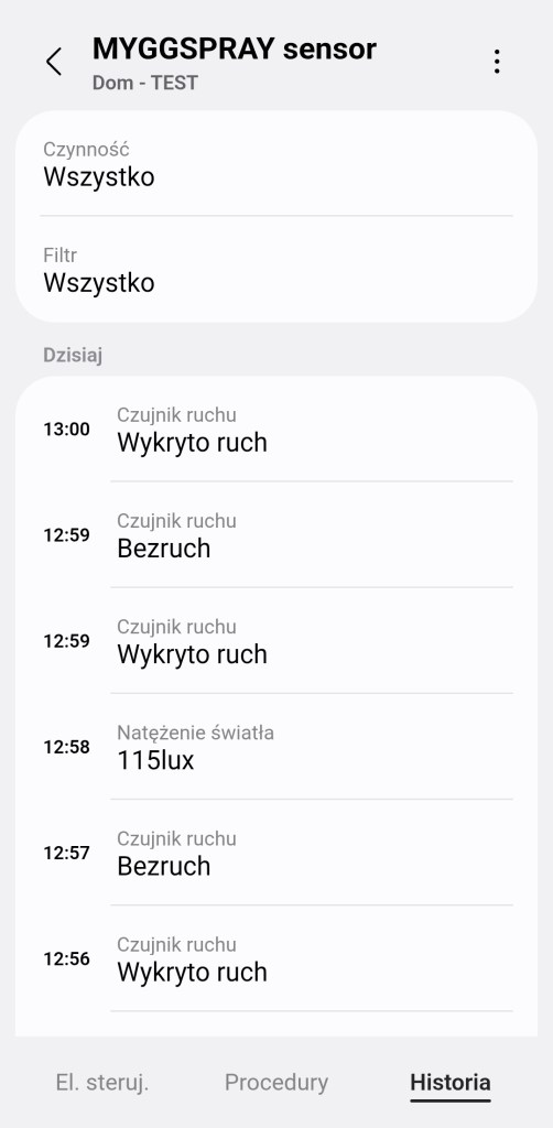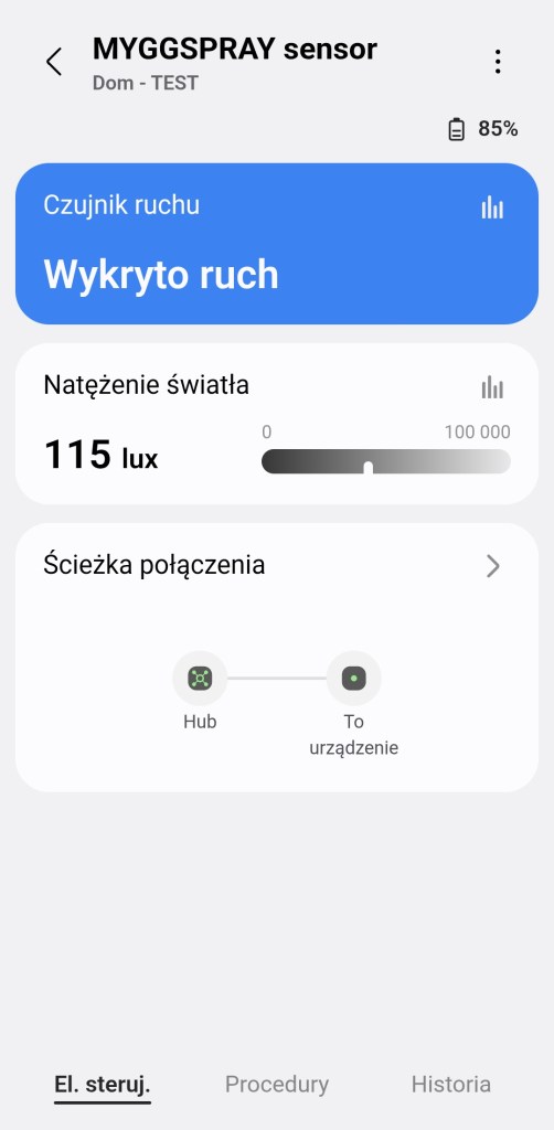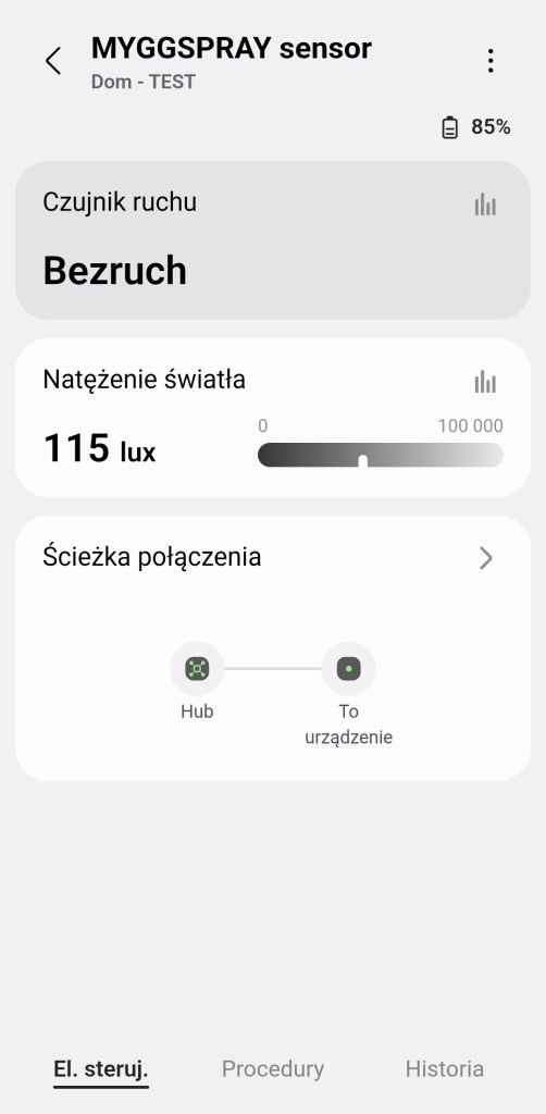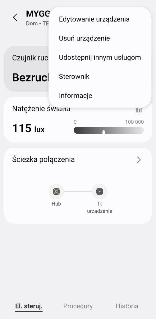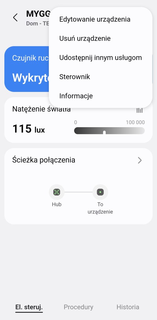 W głównym panelu sterowania urządzeniem mamy informację o stanie czujnika „Wykryto ruch” bądź „Bezruch”. Poniżej znajdziemy informację o natężeniu światła w luxach. Kolejną informacją jest poziom baterii w górym prawym rogu. Ostatnia informacja to ścieżka połączenia z centralą. Na dole znajdziemy sekcję panel „Procedury” (dawniej „Automatyzacje”), gdzie znajdziemy listę procedur, w których używany jest czujnik ruchu IKEA. Panel „Historii” nie różni się znacznie od innych urządzeń, mamy dostęp do sortowania i przestudiowania historii działań sensora. W ustawieniach „Edytuj” mamy standardową możliwość zmiany nazwy oraz pokoju.
