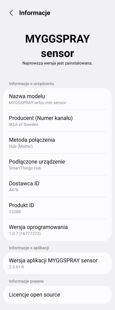 Do sterowania czujnikiem IKEA używamy domyślnego sterownika SmartThings Edge dla przeznaczonego dla urządzeń z kategorii „Matter Sensor” z protokołem Thread. Sterownik to Matter Sensor autorstwa programistów SmartThings.