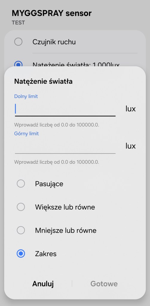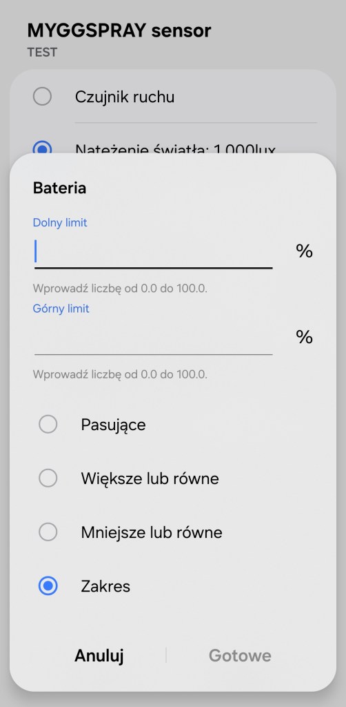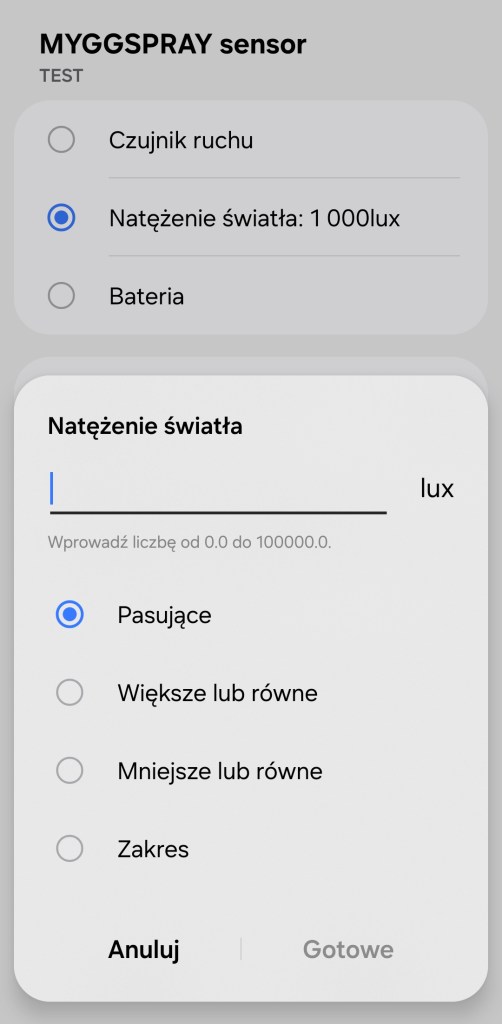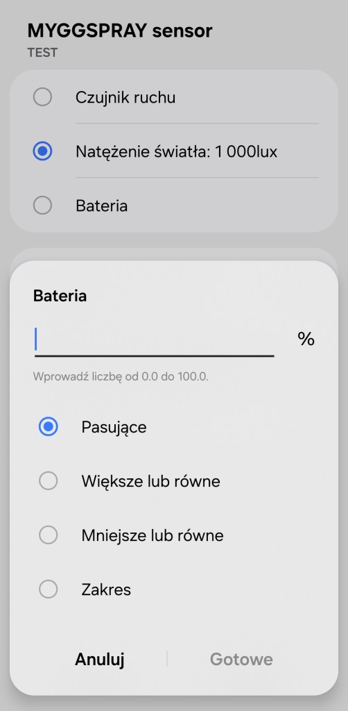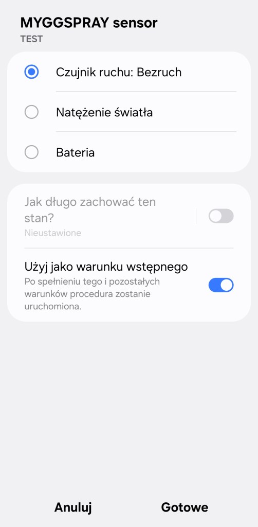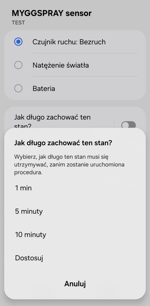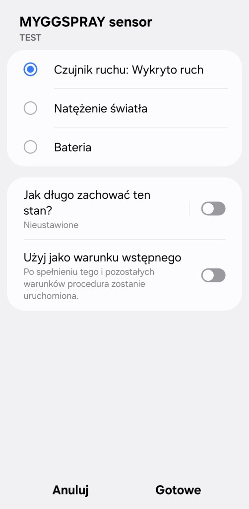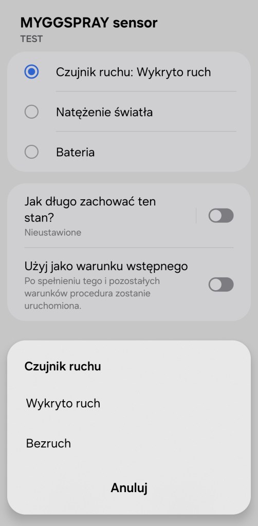 Przy tworzeniu procedur, dawniej automatyzacje „Jeśli … to Wtedy”, ze względu na specyfikę urządzenia, możliwe jest tylko wykorzystanie warunku „jeśli”. Czujnik IKEA w pierwszej kolejności pozwala na wybranie opcji „Czujnik ruchu”, posiada on dwa stany „Wykryto ruch” oraz „Bezruch”. Następną opcją jest „Natężenie światła” w zakresie 0 – 100000 lux, w tym, czy jest pasująca, większa/mniejsza czy w określonym zakresie. Kolejną jest opcja otrzymania powiadomienia o poziomie baterii z zakresu 0 – 100% w tym, czy jest pasująca, większa/mniejsza czy w określonym zakresie. Każdą akcję możemy opóźnić o dowolny czas oraz określić, jako warunek wstępny.