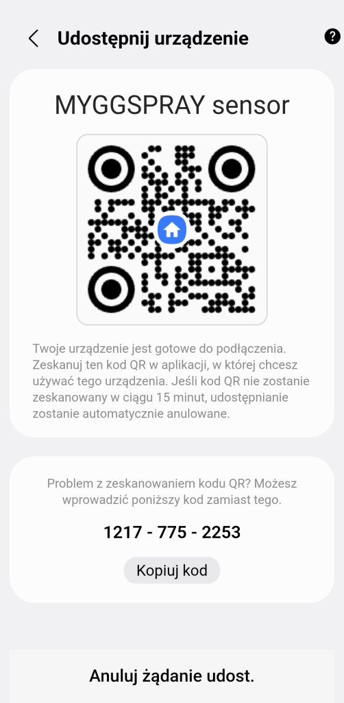 Jeśli chcemy udostępnić czujniki IKEA innej aplikacji obsługującej urządzenia spod szyldu Matter. Musimy zdobyć kod udostępniania. W aplikacji SmartThings znajdziemy go po wejściu w panel starowania, następnie Więcej opcji ( ⋮ ), dalej Udostępnij innym usługom. Na dole pojawi się Kod QR, kliknij go, a po chwili zostanie wygenerowany kod udostępniania. Możesz zeskanować kod QR inną aplikacją lub spisać kod i użyć go w innej aplikacji.