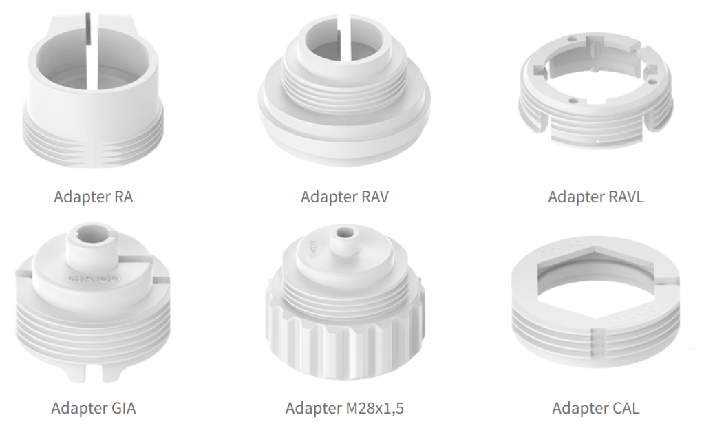 Poniższe adaptery są dołączone do inteligentnego termostatu. Numer kodu adaptera można znaleźć pod każdą ilustracją adaptera. Zamontuj odpowiedni adapter na kaloryferze, obracając go, aż usłyszysz kliknięcie. Mamy do dyspozycji adaptery RA, RAV, GIA, M28x1,5, RAVL i CAL.