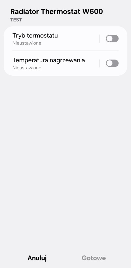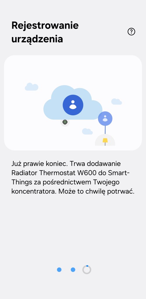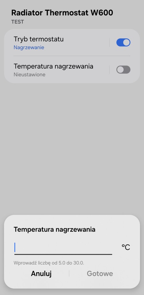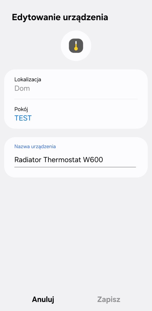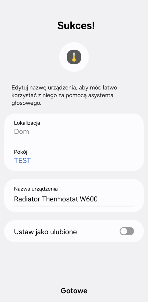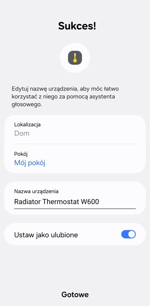 Dodanie do ekosystemu jest proste należy postępować zgodnie z instrukcją w aplikacji SmartThings. Klikamy na ekranie głównym przycisk Dodaj ( + ), w prawym górnym rogu ekranu. Następnie Dodaj urządzenie, kliknij Dodaj w sekcji Urządzenia partnerów. Z listy wybierz Matter. Musimy zeskanować kod QR znajdziemy go na głowicy i w instrukcji obsługi. Jeśli posiadasz więcej niż jeden koncentrator to pojawi się monit o wyborze, stuknij Dalej. Po chwili cierpliwości (do około 1 minuty), nowy termostat zostanie automatycznie dodany do platformy SmartThings. Teraz możemy zmienić pomieszczenie oraz nazwę. Kończmy proces instalacji, wybierając Gotowe. Głowica W600 pojawi się w wybranym pokoju i jest gotowa do użytku.