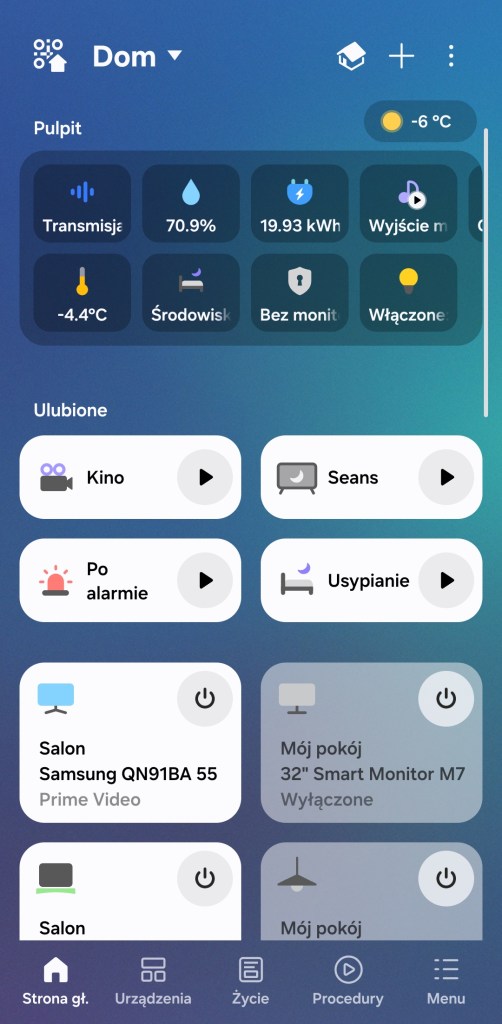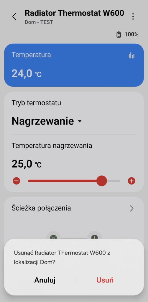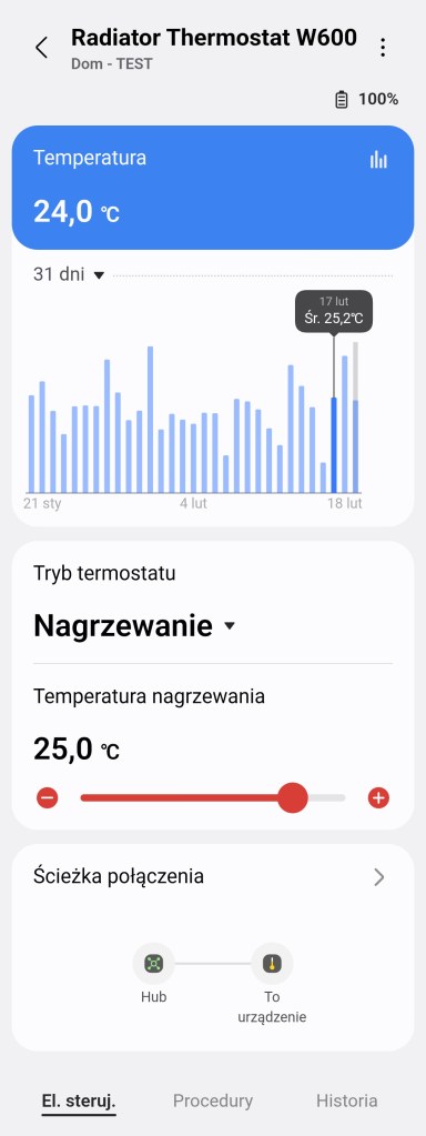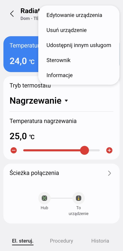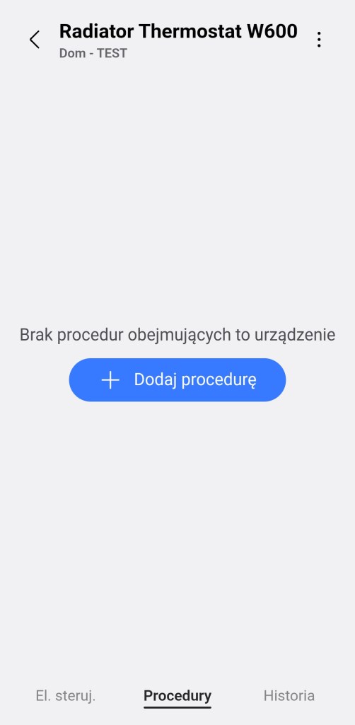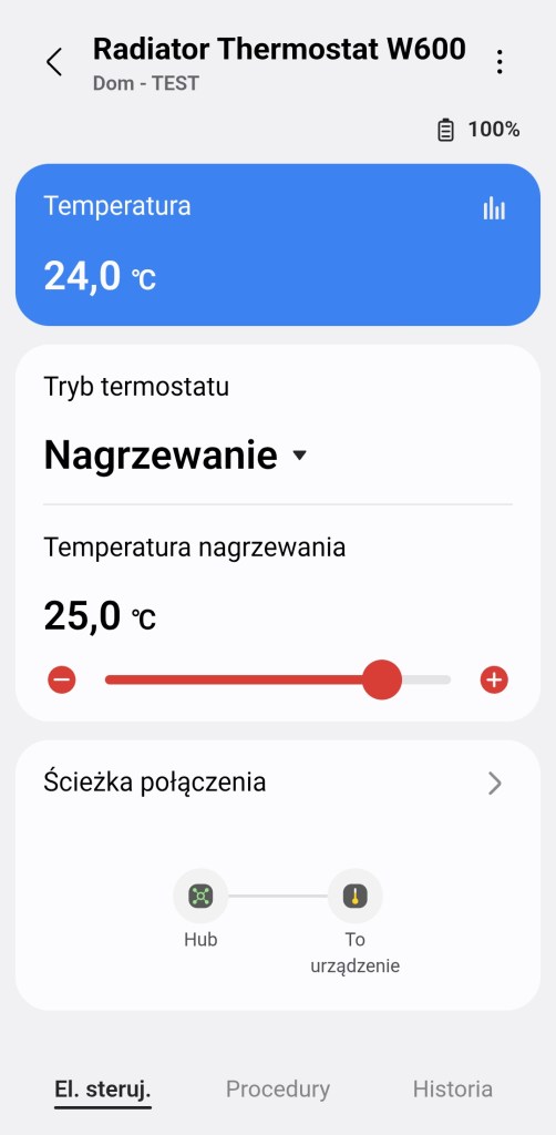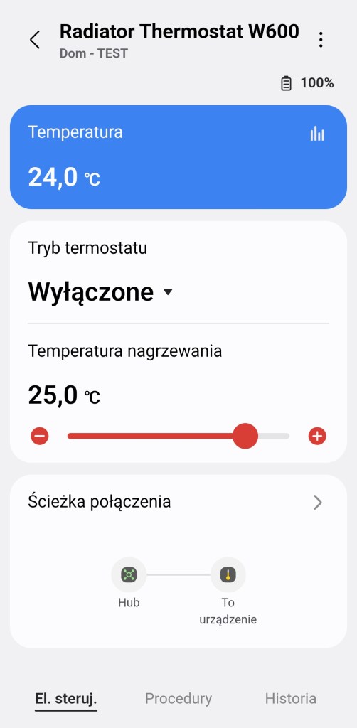 W głównym panelu urządzenia mamy informację o odczytanej temperaturze, możliwość nastawienia temperatury nagrzewania, ze skokiem co 0,1°C. Informację i możliwość zmiany trybu termostatu: Wyłączony i Nagrzewanie. Niżej dostęp do ścieżki, jak urządzenie łączy się z centralą. Na górze po prawej stronie widzimy procentową informacje o poziomie baterii głowicy termostatycznej. Na dole znajdziemy panel „Procedury” (dawniej „Automatyzacje„) znajdziemy tutaj wszystkie procedury w których wykorzystywane jest urządzenie. Panel „Historii” nie różni się znacznie od innych urządzeń, mamy dostęp do sortowania i przestudiowania historii działań termostatu. W ustawieniach „Edytuj” mamy standardową możliwość zmiany nazwy i pokoju.