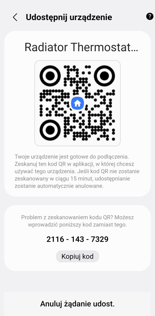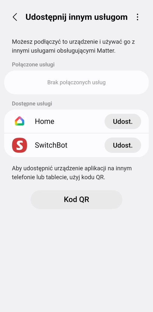 Jeśli chcemy udostępnić głowice Aqara innej aplikacji obsługującej urządzenia spod szyldu Matter. Musimy zdobyć kod udostępniania. W aplikacji SmartThings znajdziemy go po wejściu w panel sterowania, następnie Więcej opcji ( ⋮ ), dalej Udostępnij innym usługom. Na dole pojawi się Kod QR, kliknij go, a po chwili zostanie wygenerowany kod udostępniania. Możesz zeskanować kod QR inną aplikacją lub spisać kod i użyć go w innej aplikacji.