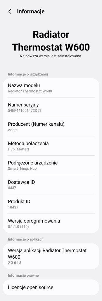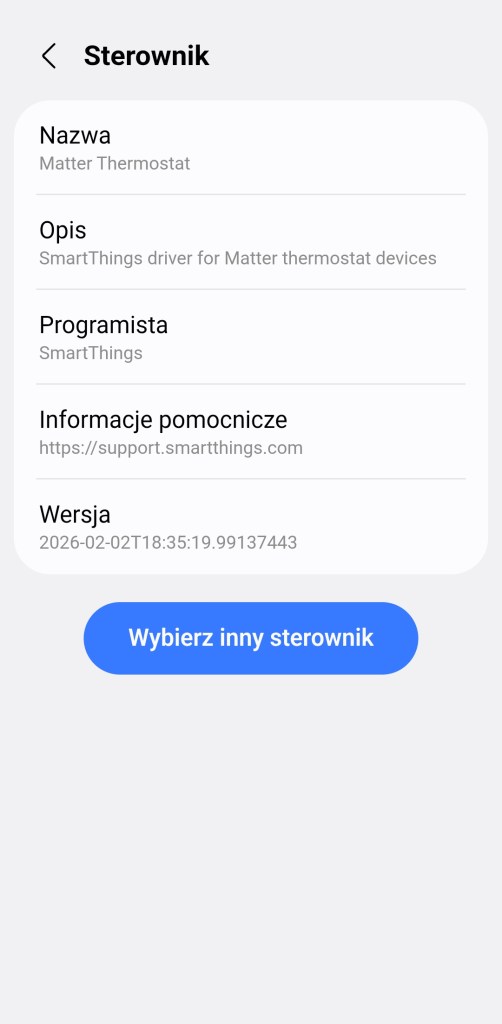 Do sterowania głowicy termostatycznej Aqara W600 używamy domyślnego sterownika SmartThings Edge dla przeznaczonego dla urządzeń z kategorii „Matter Thermostat” z protokołem Thread. Sterownik to „Matter Thermostat” jst autorstwa programistów SmartThings.