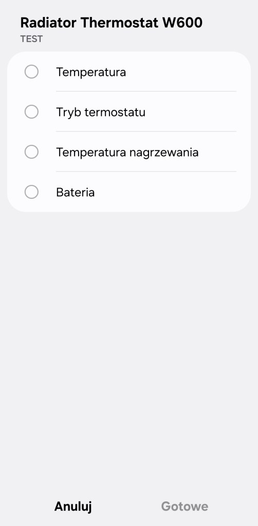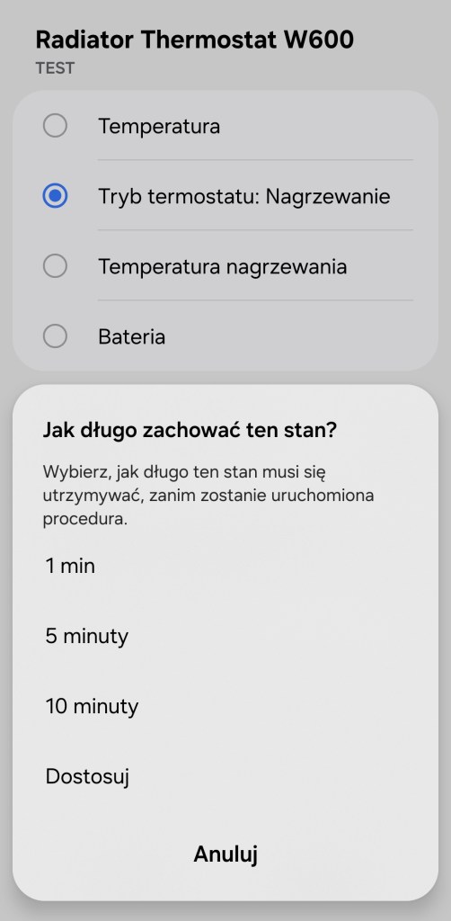 Tworzenie procedur (dawniej automatyzacje) „Jeśli … to Wtedy” musimy podzielić na dwa etapy, ponieważ znacznie różnią się dostępne opcje jeśli inicjujemy warunek „Jeśli”. W pierwszej możliwości „Jeśli” urządzenie pozwala na wybranie opcji „Temperatura” czyli powiadomienie o zmierzonej temperaturze z zakresu -20 – 50°C, w tym czy są większa/mniejsza niż odczytana oraz zakres. Następna opcja to tryb termostatu z dwoma możliwościami „Wyłączone” i „Nagrzewanie”. Dalej jest „Temperatura nagrzewania” czyli powiadomienie o temperaturze z zakresu 5 – 30°C, w tym czy są większa/mniejsza niż odczytana oraz zakres, gdzie maksymalnie może wynosić 5 – 30°C. Ostatnia to informacje o poziomie baterii z zakresu 0 – 100% w tym czy jest pasująca, większa/mniejsza czy w określonym zakresie. Każdą z czynności możemy opóźnić lub nadaj jej warunek wstępny.