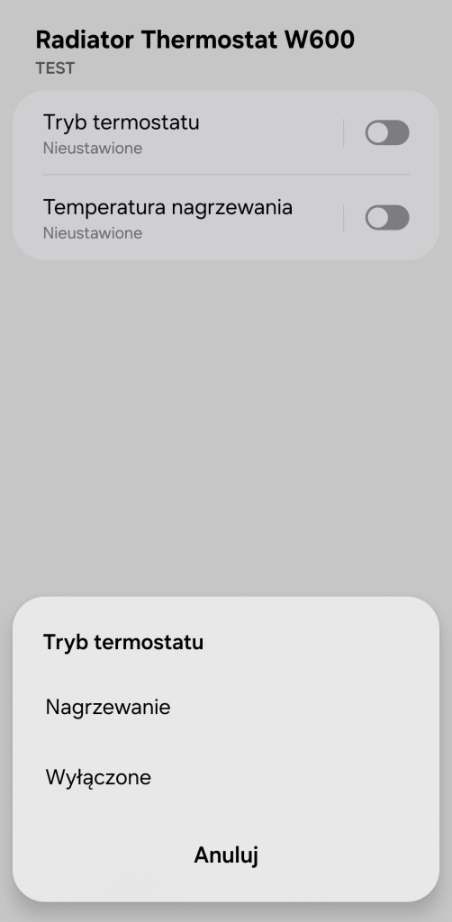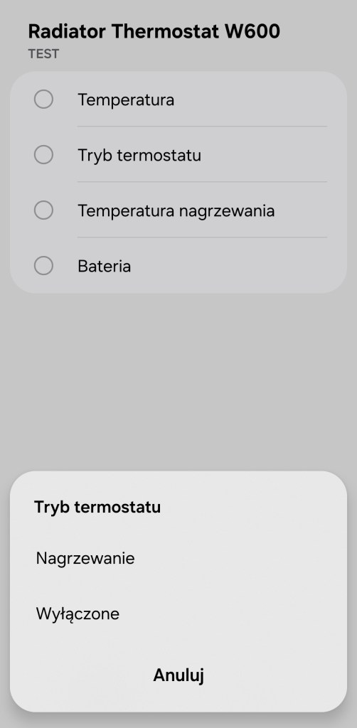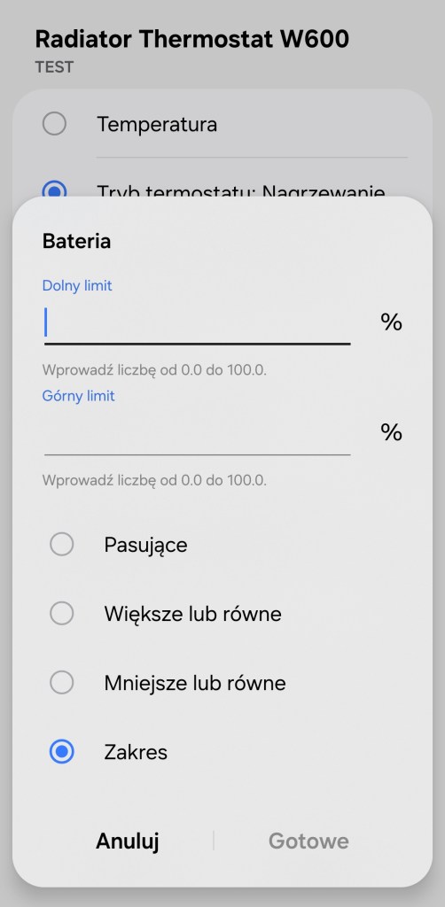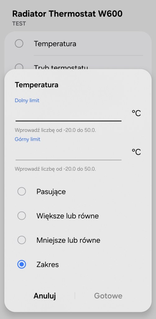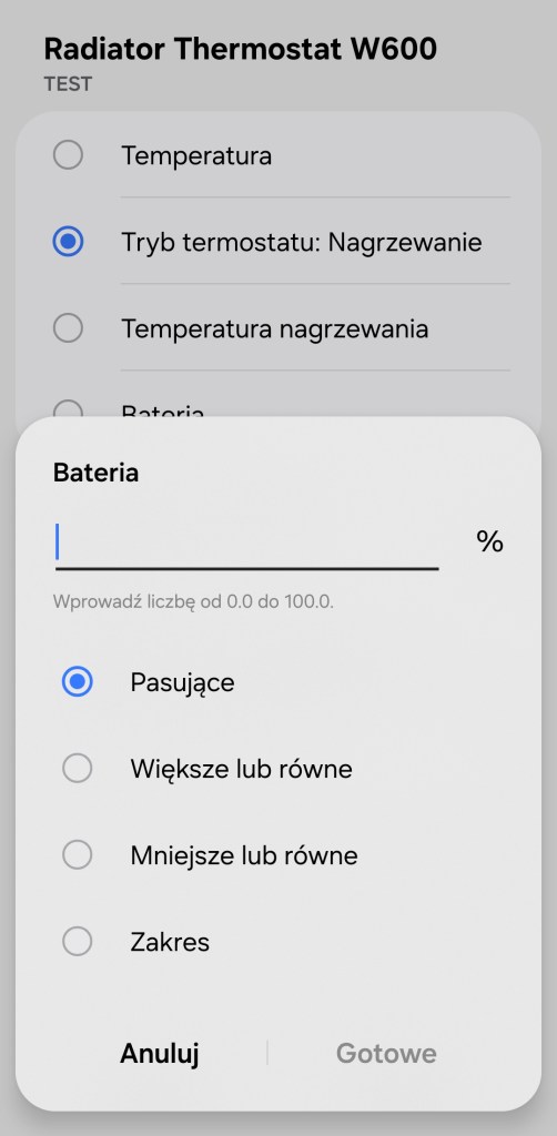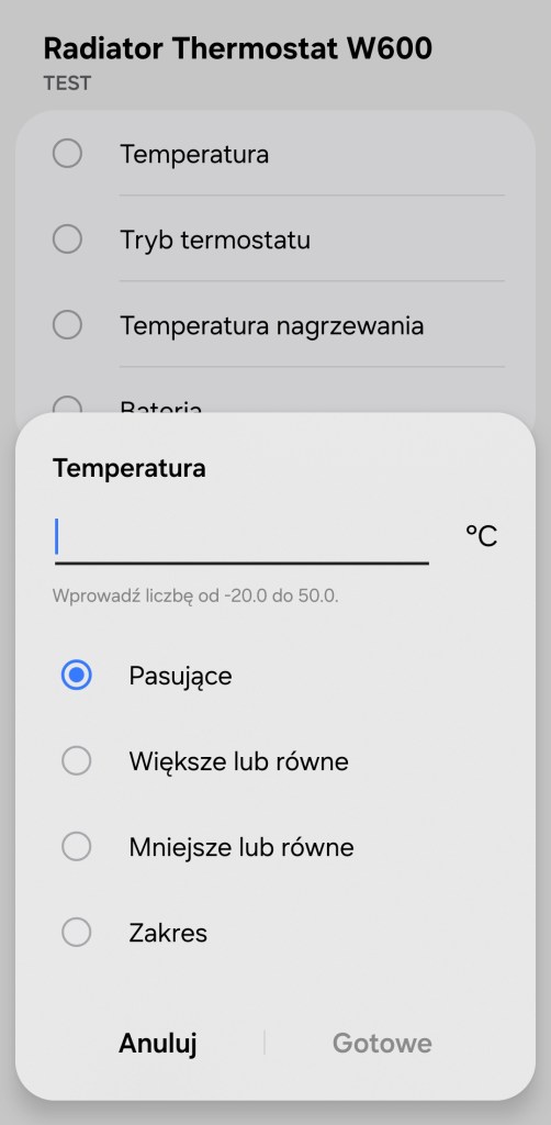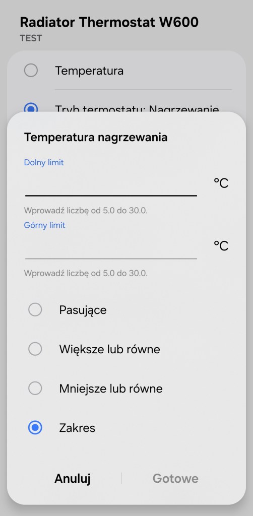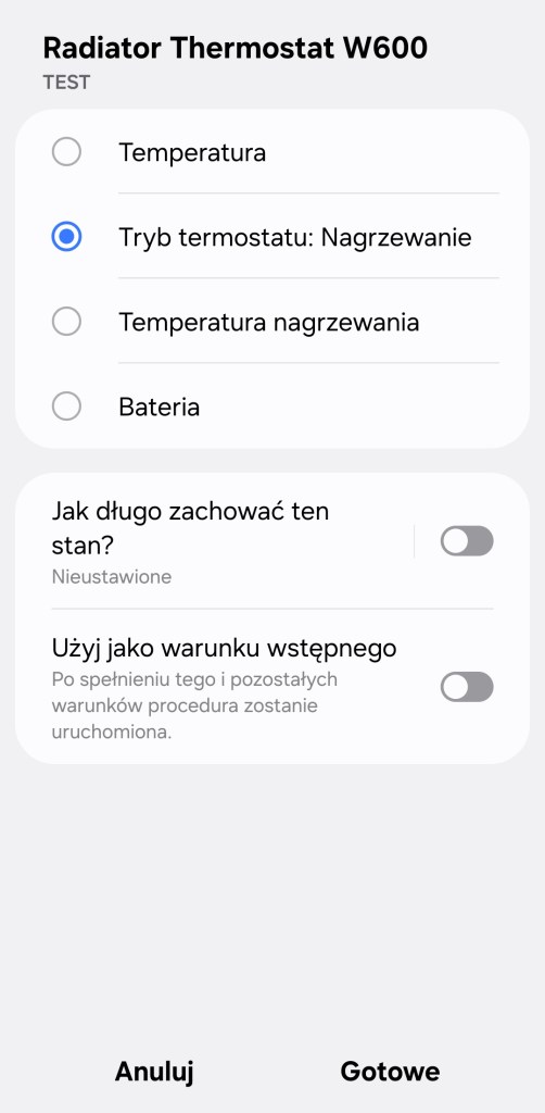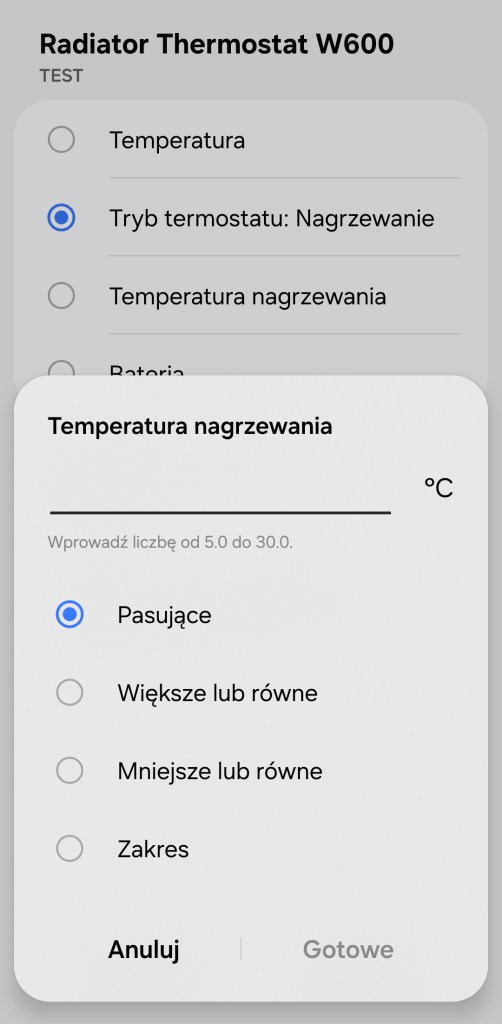 W drugiej możliwości „Wtedy”, mamy możemy nastawić tryb termostatu: „Wyłączone” i „Nagrzewanie”. Następnie „Temperatura nagrzewania” czyli ustawienie porządanej temperatury w pokoju z zakresu 5 – 30°C, w tym czy są większa/mniejsza niż odczytana oraz zakres, gdzie maksymalnie może wynosić 5 – 30°C.