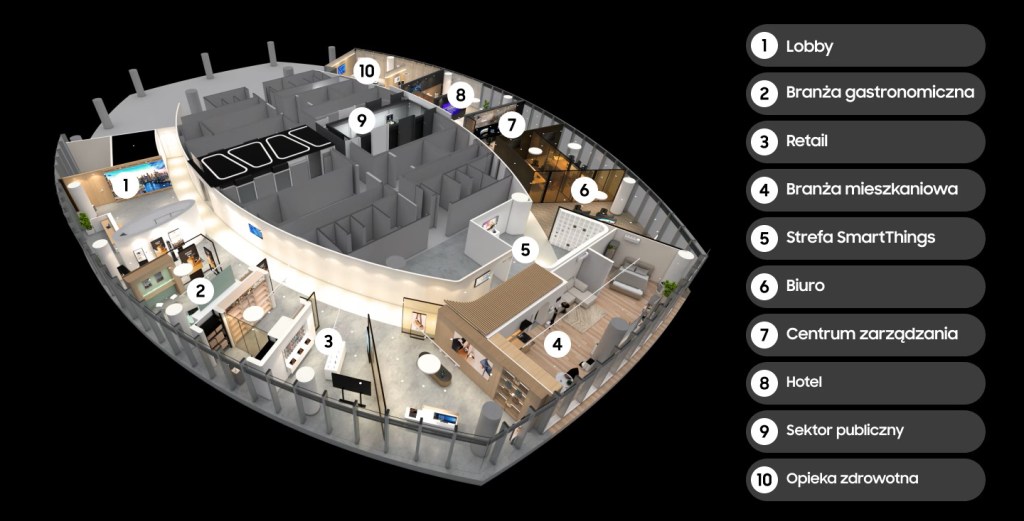 W Business Experience Centre technologie spotykają się z realnymi potrzebami biznesu. Każda z tematycznych stref pokazuje inny wymiar cyfrowej transformacji. W części Residential prezentowane są inteligentne domy i budynki zarządzane przez SmartThings Pro, z naciskiem na efektywność energetyczną i neutralność klimatyczną. Retail to z kolei wizja sklepu przyszłości, w którym AI i IoT automatyzują obsługę i sprzedaż. Strefa Corporate & Finance pokazuje hybrydowe środowiska pracy, łączące bezpieczeństwo platformy Knox z rozwiązaniami DeX i SmartThings. W obszarze Healthcare prezentowane są rozwiązania dla telemedycyny, mobilnej diagnostyki i wearables wspierających szybszą i dokładniejszą opiekę zdrowotną. Hospitality to hotele przyszłości z cyfrową obsługą gości i IoT w pokojach, a Control Room – zaawansowane centrum zarządzania infrastrukturą i energią budynków. Całość uzupełnia strefa Government & Security, w której zastosowano technologie oparte na Samsung Knox i komunikacji klasy NATO.