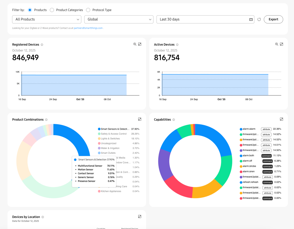 Zaktualizowane Centrum programistów obejmuje narzędzie SmartThings Partner Analytics, które zapewnia wgląd w sposób, w jaki klienci korzystają z Twoich produktów, dbając jednocześnie o prywatność użytkowników: