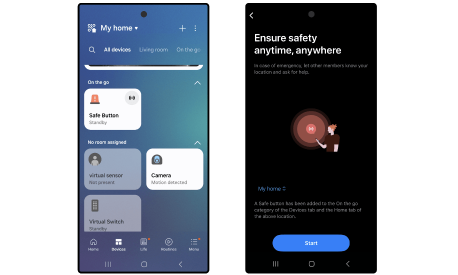 SmartThings wprowadza nową funkcję w zakładce Życie – SmartThings Safe Button. Jednym kliknięciem w aplikacji SmartThings możesz natychmiast wysłać powiadomienie push z prośbą o pomoc i swoją lokalizacją GPS do rodziny i znajomych dodanych jako członkowie lokalizacji – zapewniając sobie codzienny spokój ducha bez żadnych kosztów.