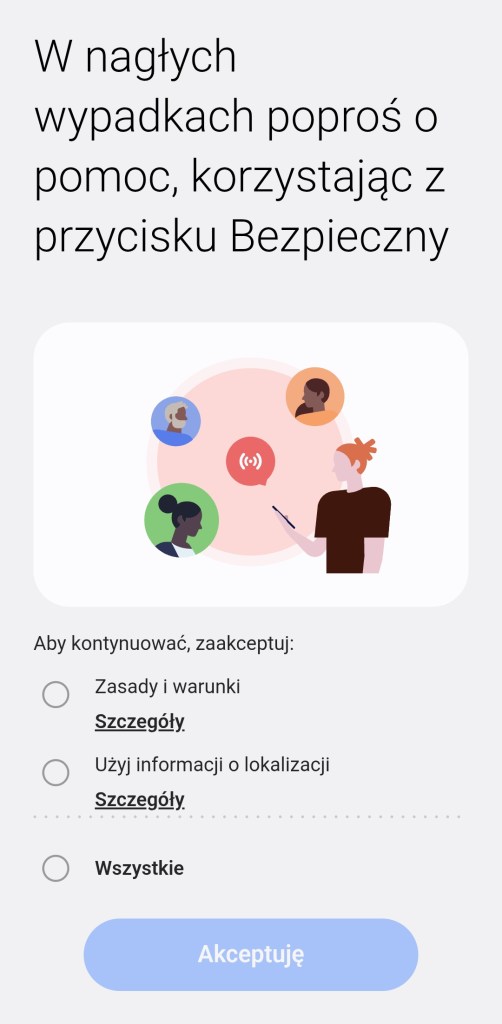 Ta usługa została stworzona, aby pomóc Ci pozostać w kontakcie z bliskimi. Przycisk bezpieczeństwa SmartThings nie dzwoni ani nie powiadamia służb ratunkowych. Zamiast tego zapewnia szybki i niezawodny sposób, aby poinformować osoby, na których Ci zależy, o Twojej lokalizacji. Uwaga: aby użytkownicy mogli wysyłać informacje o swojej lokalizacji w czasie rzeczywistym, muszą mieć włączone usługi lokalizacyjne na swoim urządzeniu mobilnym.